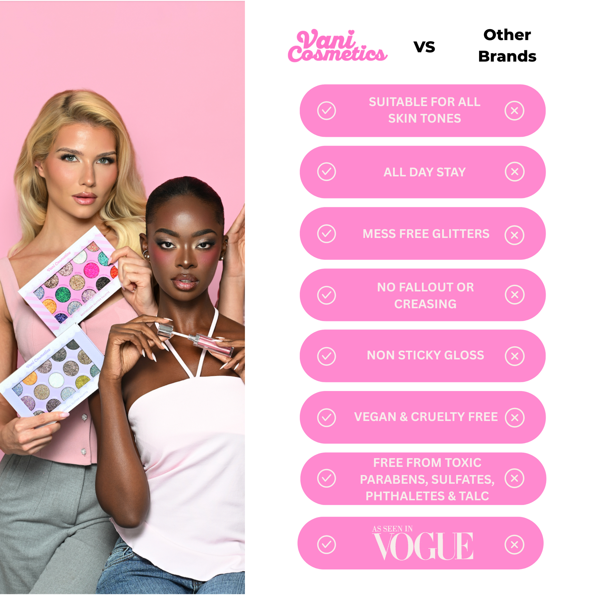Our glitter makeup products are made with skin-safe glitter; however, we recommend that our customers always use caution when applying any glitter product. Our pressed glitters are not for use in the eye area. Use our glitters with caution and at your own risk and discretion. We cannot be responsible for any injuries that may occur, or for unsafe or improper usage.